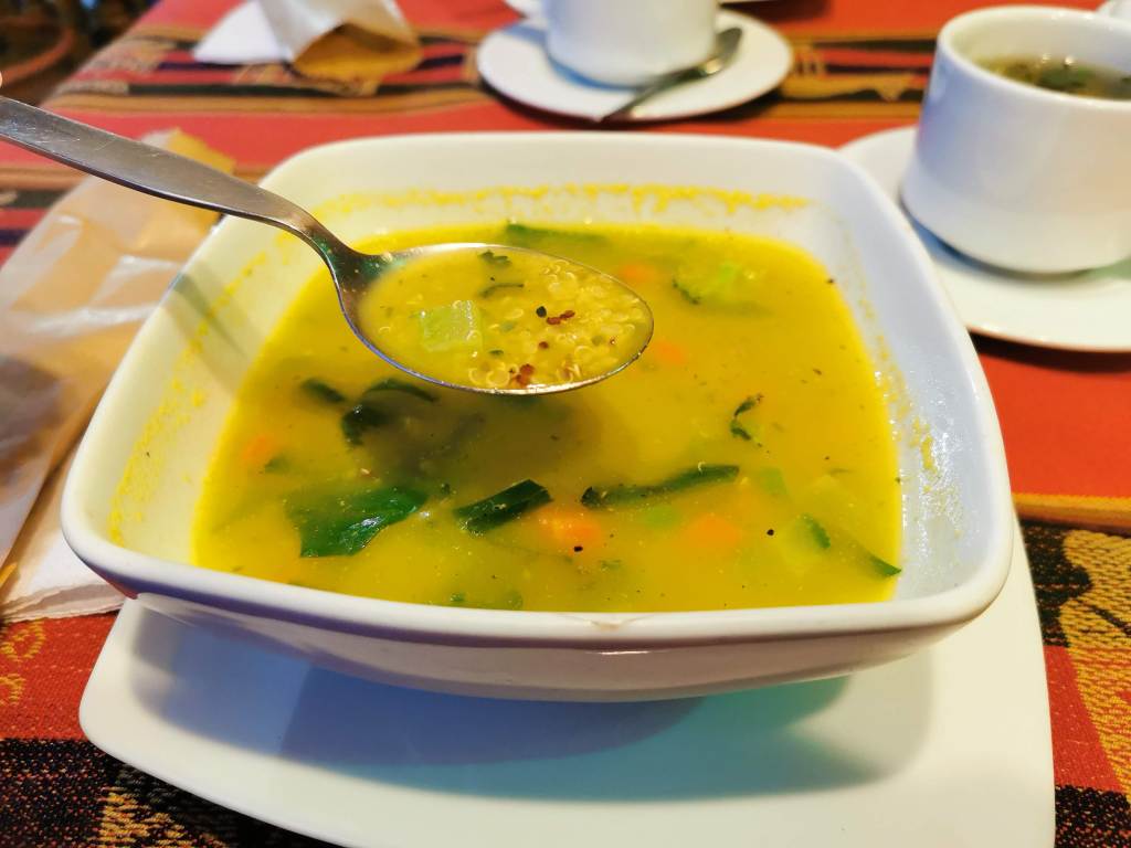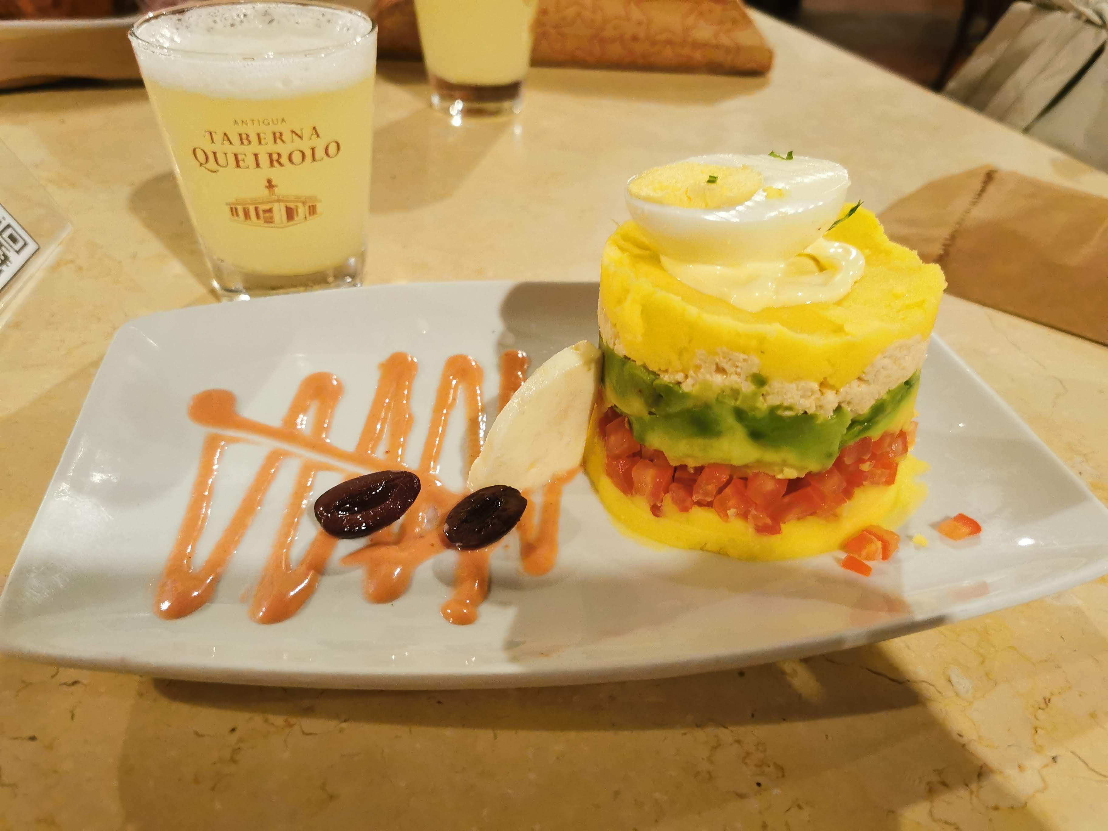 Már az első este megismerkedtünk a perui itallal , Pisco sour-ral, ami egy koktél. Pisco a peruiak nemzeti itala, szőlőből készült párlat, ezt keverik tojásfehérjével, lime-mal, cukorsziruppal. Az étel pedig krumpli, csirke, avokadó, paradicsom.