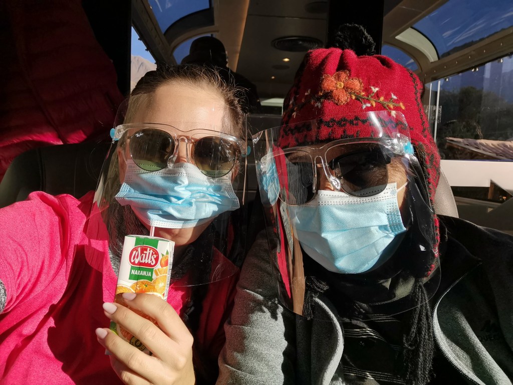 Az Incarail a világ egyik legszebb vasútja, ami az Urubamba folyó partján fut, másfél óra Aguas Calientes-ig. Ez egy teljesen új mozdony volt, The 360 névre hallgat, tetőablakai vannak (de ezek a régebbieknek is voltak), és volt egy kocsi, ahova be lehetett menni, és nyitott volt az oldala, süvített a szél és üvöltött a perui zene. Iszonyatosan hangulatos volt. Sajnos nagyon komoly intézkedések voltak a vonaton, látjátok, be vagyunk öltözve. Én már ezen a reggelen kettétörtem ezt a műanyag szemüveget, de kibírta az utazás végéig, csak már nem láttam át rajta utolsó nap. 😂 Tömegközlekedésen volt még rá szükség párszor.