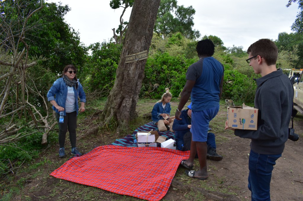 Oroszlánok után elindultunk az ebéd helyünkre, útközben gyönyörködtünk a horizonton sétáló elefántokban, nem lehet ehhez hozzászokni. Piknik helyszínünk a Masaai folyó partján volt, ahol vízilovak és krokodilok napoztak. Kis majmok köszöntöttek minket, amint leterítettük a Masaai mintás takarókat a földre. El is lopták az almám. Még jó, hogy ki van írva, hogy ne etesd az állatokat. Etetik ők magukat… 😅