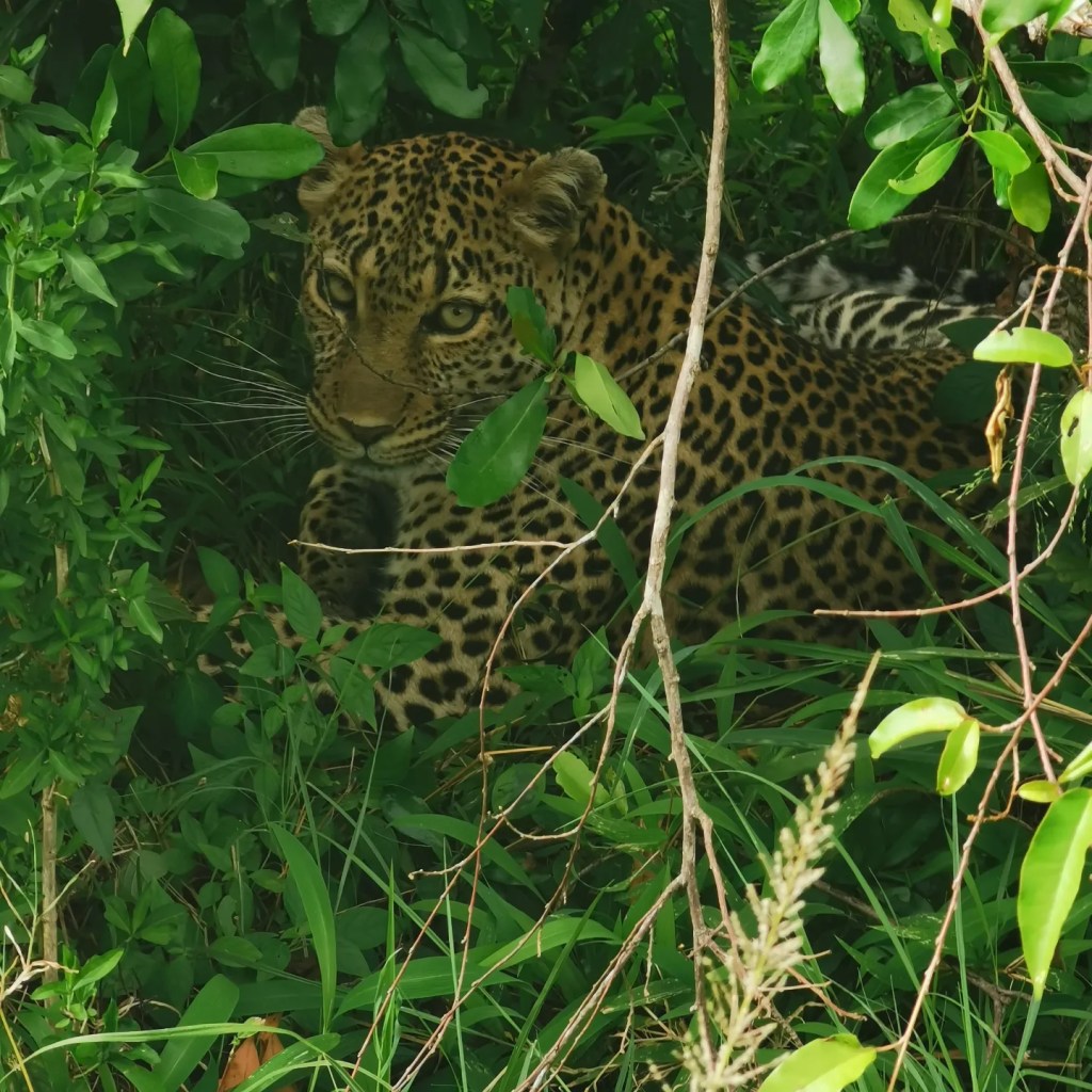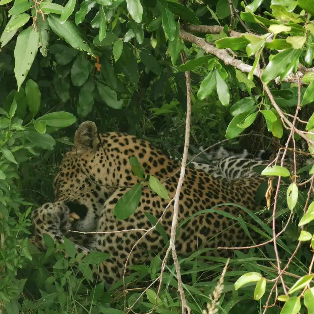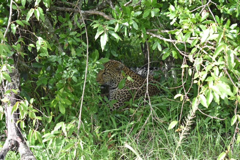 Moses hallott valamit a rádión, tehát megint nagyon kellett kapaszkodnunk, hogy ne fejeljünk le valamit a kocsiban. Visszatértünk ugyanahhoz a fához, ahol az impala lógott le darabokban az egyik ágról. Egy bokorban távcsővel lehetett látni a leopárd pöttyeit. Kb. 50 percet vártunk, hátha megmutatja magát. Itt azért kiderültek a park szabályai. Az útról se lehet lemenni (ez eddig nem tűnt fel, elég sok volt az offroad), mert kérdeztem Mosest, hogy miért nem megyünk oda a leopárdhoz és mondta, hogy a rangerek miatt. A közelben vannak. Később azt is megtudtuk, hogyha megszegik a szabályokat, 100 dollár bünti jár, de bevállaljak a sofőrök általában, mert nem buknak le. Rájöttünk, hogy arra várunk, hogy a rangerek elmenjenek a közelből. Egyszer csak megjött a várva-várt rádióhívás, hogy mehetünk. Így olyan közel tudtunk menni a leopárdhoz, hogy lássuk őt, mennyire gyönyörű. Ott mosakodott a bokorban. Fantasztikus látvány volt. Órákig tudtuk volna nézni.